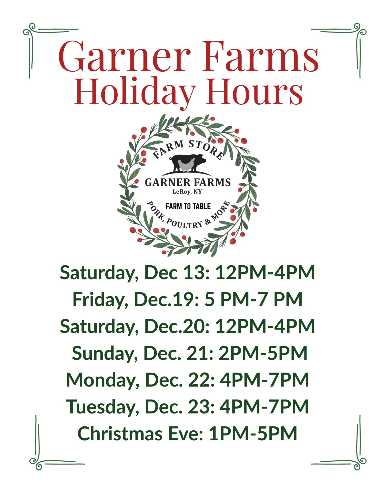 Farm Store Holiday Hours~ Sat. 12/20 12-4PM, Sun. 12/21 2-5PM, Mon-Tues 4-7PM, Christmas Eve 1-5PM